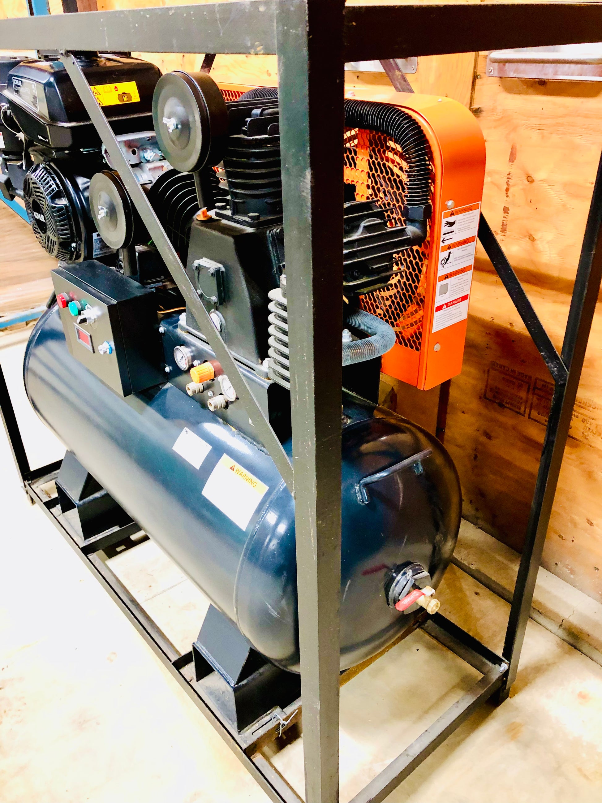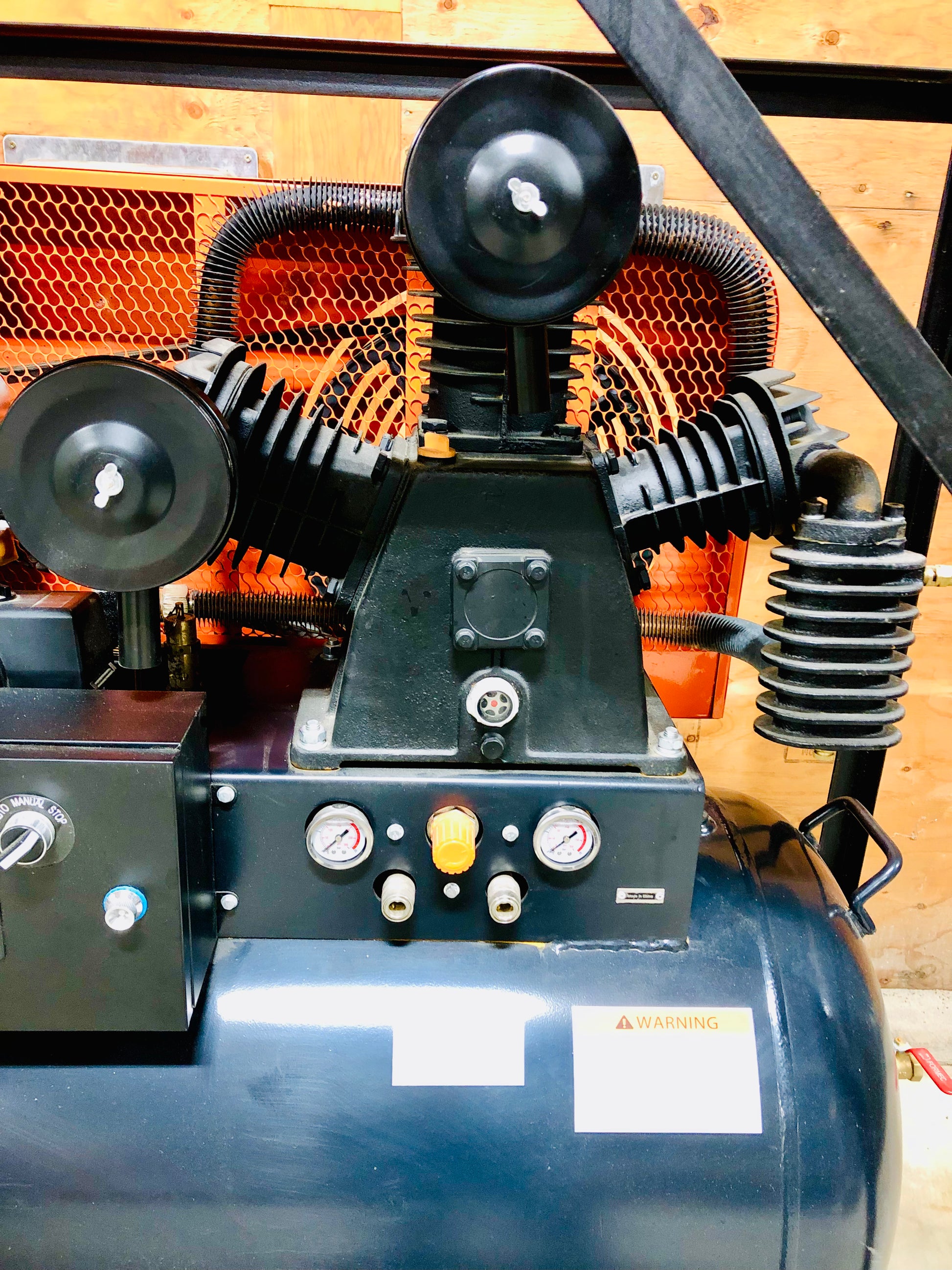 - Two-stage cast iron compression pump that is belt driven to produce superior air pressure capable of handling multiple tools over an extended period of time