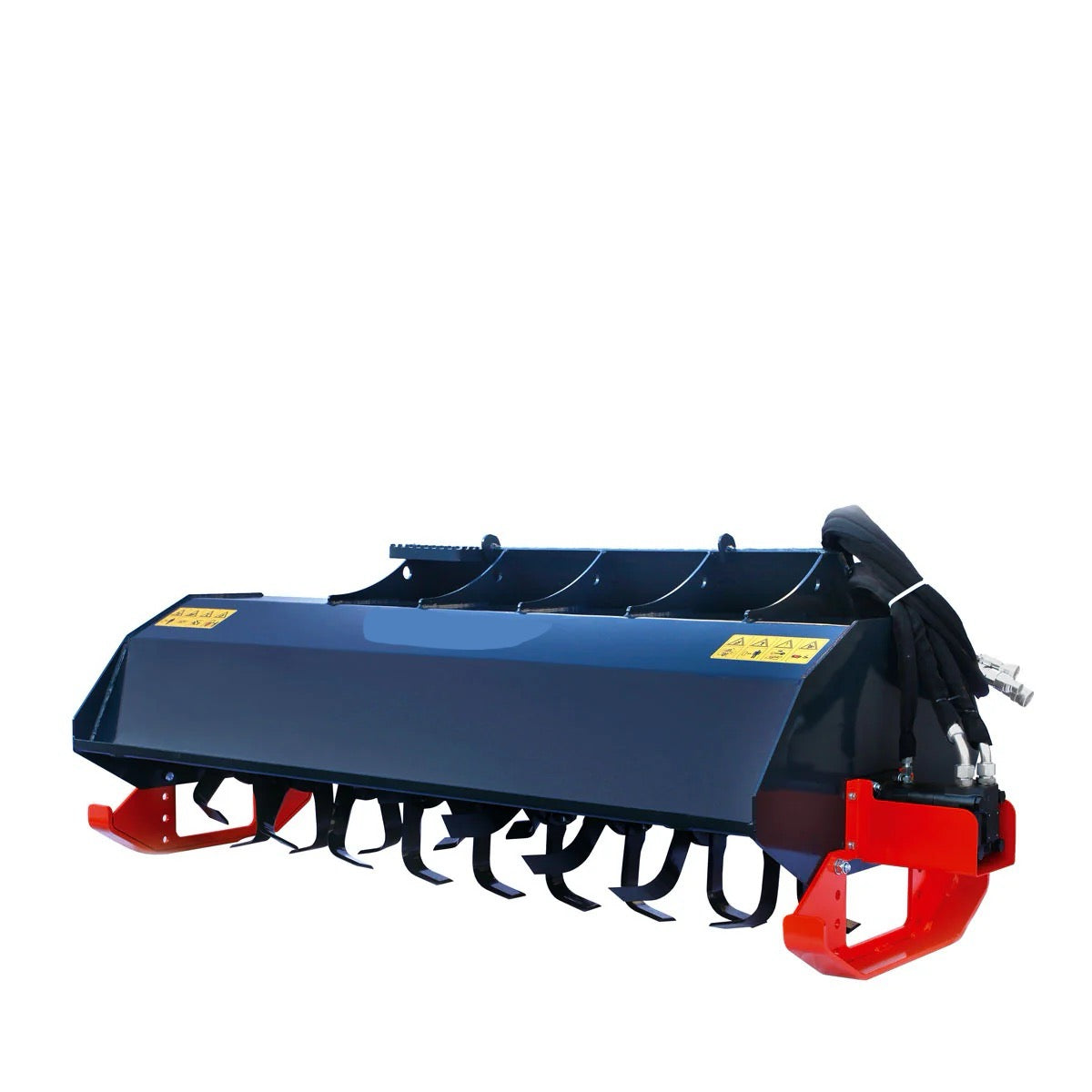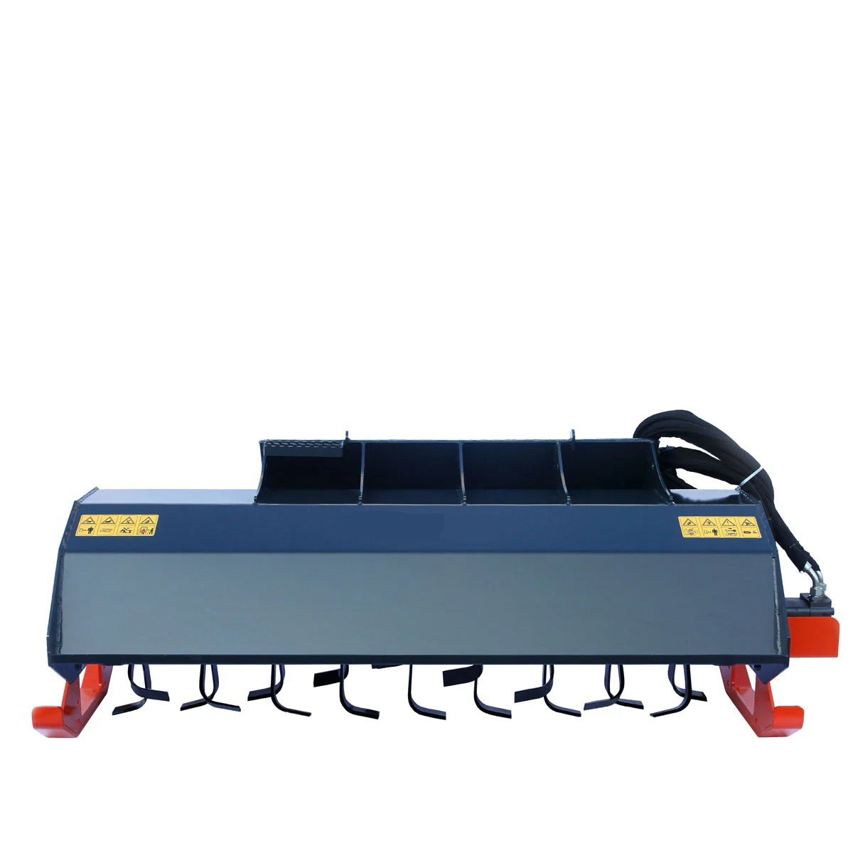 - Included flat face couplers, hydraulic hoses and a universal mount that makes this tiller compatible with most skid steer makes and models